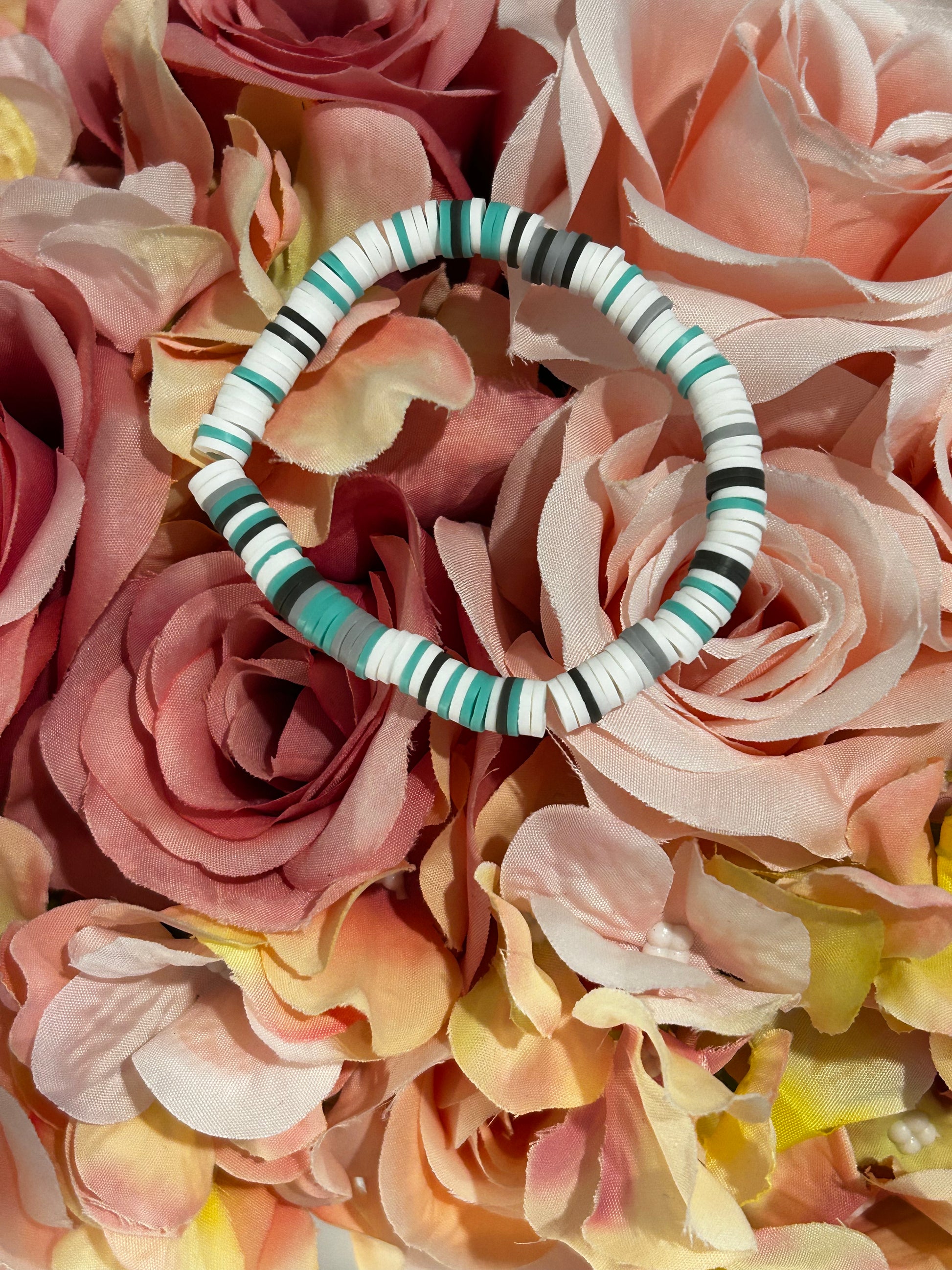 Dive into a cool aesthetic with this striped clay beaded bracelet. Featuring a refreshing palette of teal, crisp white, slate gray, and charcoal black, this piece offers a clean, rhythmic design. Its flat-disc texture provides a smooth, comfortable fit, making it an ideal accessory for a day at the beach or a casual city outing.